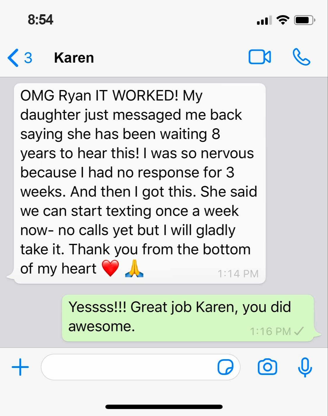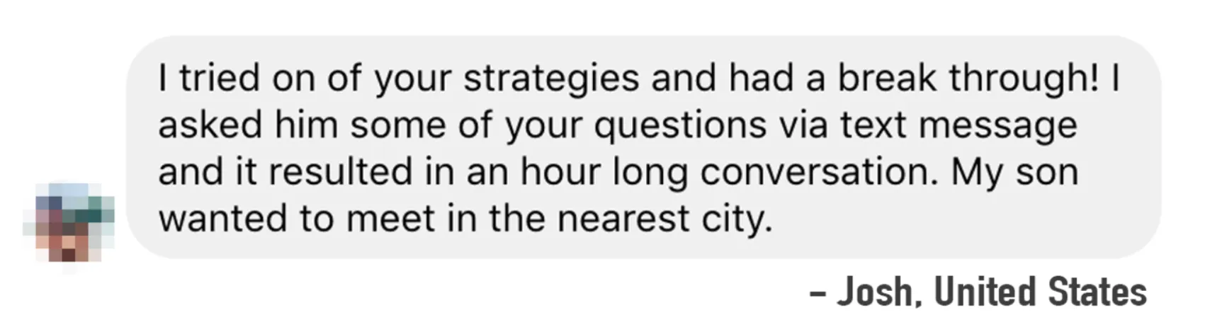 DISCLAIMER: All products and services by our company are for educational and informational purposes only. Your level of success in attaining any stated ideas or strategies in our programs or on our websites may be dependent upon a number of factors including your ability, access, knowledge, dedication, goals, and limitations including the in-ability to control others behavior to name a few. Because these factors differ according to individuals, we cannot guarantee your success or results in any area of life or any endeavor. As stipulated by law, we make no guarantees that you will achieve any specific results from our information, programs or services and we offer no licensed or professional psychological, medical, legal, therapeutic, tax, or financial advice in this program. The information contained herein cannot replace or substitute for the services of trained professionals in any field, including, but not limited to, medical, psychological, financial or legal matters. You alone are responsible and accountable for your decisions, actions and results in life, and by your registration here today and use of our programs or websites at any time, you agree not to attempt to hold us liable for any such decisions, actions or results, at any time, under any circumstance. As with any effort, there are risks that you may not make progress or achieve a desired outcome. We are simply trying to help you in every possible way build stronger relationships, live a happier life, and be a positive force in this world. There are NO refunds. If you ever need anything from us, just reply to any of our emails. We value, appreciate and respect your time and dedication to getting closer to reconnecting with your child. You also agree to our terms, conditions and privacy listed on the bottom of this page. By purchasing this program from us, you agree that we can contact you in the future, use your data/information to deliver our services or related content, ask your about your experience, or offer help to improve your situation. We are here for you anytime at [email protected]Â Â All of our terms, privacy policies and disclaimers for this program and website can be accessed via the links below. It's pretty straight-forward - you're not guaranteed to get any results easily or at all, you are responsible for your results -- but we love transparency, which is why we share everything about our programs so you can make the best decision possible.Â